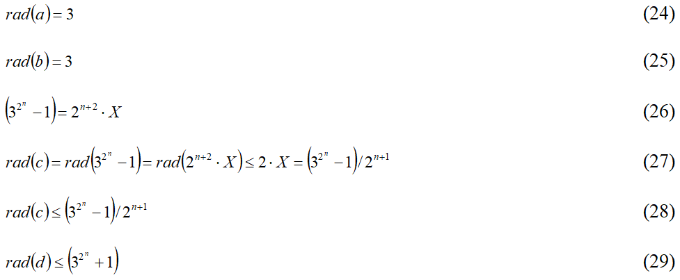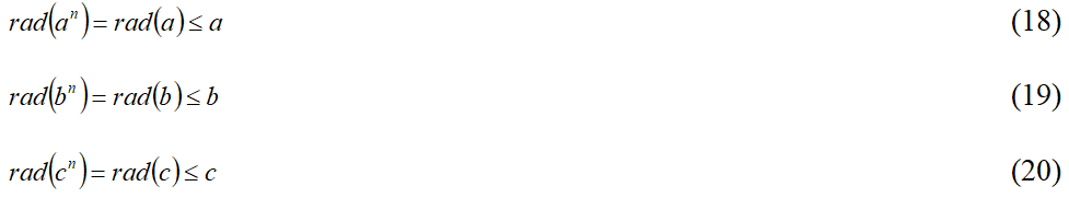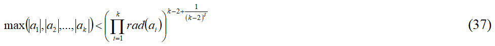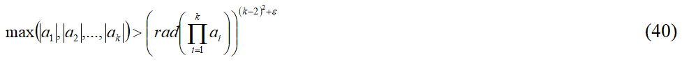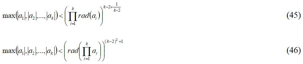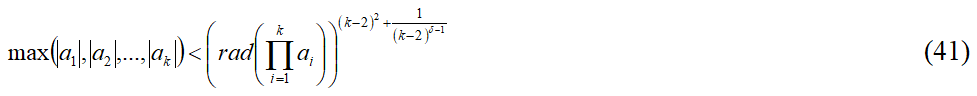 Как видно из тройки неравенств (35), (36), (37) и тройки неравенств (39), (40), (41), при k = 3 они становятся равными тройке неравенств (14), (15), (16), отражающих классические формулировки abc-гипотезы.