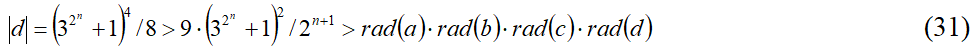 Как видно, в данном случае |d| строго больше произведения радикалов слагаемых при n ≥ 1. Определим насколько это число больше в плане показателя: