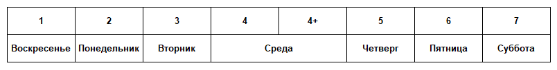 Если в ту или иную неделю добавляется 1 день, то 4-ый день недели (середина недели) будет длиться 2-е суток. При этом предлагается начинать неделю с воскресенья, чтобы 1-ый и последний дни недели были выходными, а средним днем была среда. Таким образом, недели с добавленным днем будут иметь такой вид: 1 – воскресенье, 2 – понедельник, 3 – вторник, 4 и 4+ – среда, 5 – четверг, 6 – пятница, 7 – суббота: