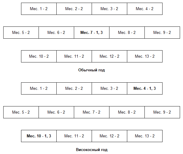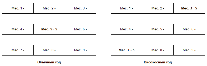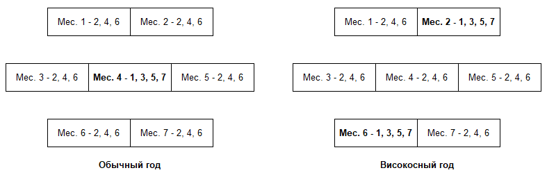 Распределение недостающих дней происходит следующим образом. Для обычного года: в месяцы 1 – 3 и 5 – 7 добавляется по 3 дня; в месяц 4 добавляется 4 дня. Для високосного года: в месяцы 1, 3 – 5, 7 добавляется по 3 дня, в месяцы 2 и 6 добавляется 4 дня.