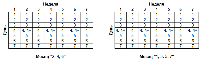 Как обычно, приведем данный универсальный календарь для обычного и високосного года в наглядном виде: