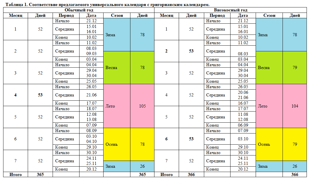 Для наглядности приведем предлагаемый универсальный календарь для обычного и високосного года: