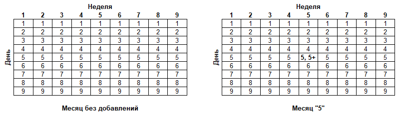 Распределение добавляемых дней по неделям внутри месяца происходит следующим образом. В те месяцы, в которые добавляется 1 день, по 1-му дню добавляется во 2-ую неделю. А в те месяцы, в которые добавляется 2 дня, по 1-му дню добавляется в недели 1 и 3.
