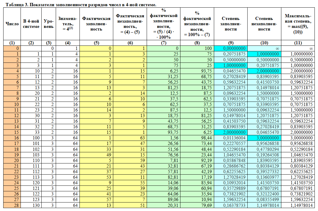 где S – основание той или иной системы счисления, натуральное число, S ≥ 2; СЗ – степень заполненности разрядов; СН – степень незаполненности разрядов; ФЗ% – процент фактической заполненности разрядов (минимальной); ФН% – процент фактической незаполненности разрядов (минимальной).