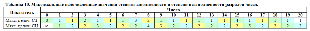 Как видно из таблиц 1 – 9, любое число имеет хотя бы в одной системе счисления целочисленное значение степени заполненности разрядов и хотя бы в одной системе счисления целочисленное значение степени незаполненности разрядов. Для каждого числа можно определить максимальное целочисленное значение степени заполненности (МЦСЗ) и максимальное целочисленное значение степени незаполненности разрядов (МЦСН).