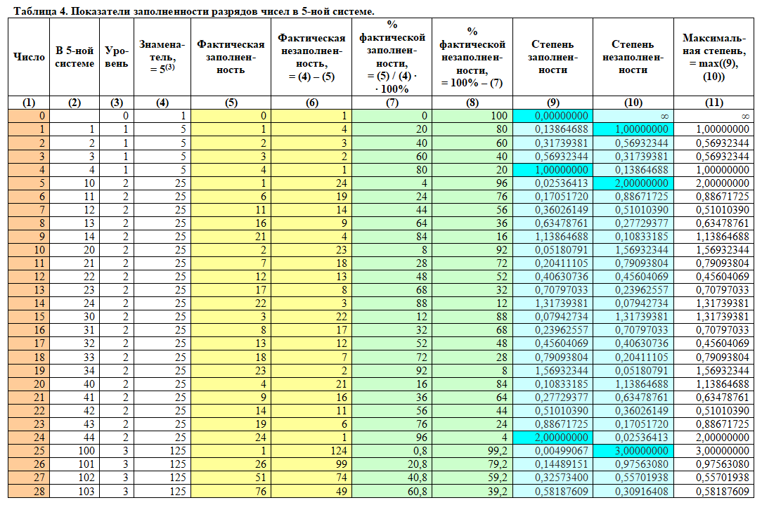 2. Приведены таблицы величин степени заполненности и степени незаполненности разрядов для систем счисления от двоичной и до десятичной для чисел от 0 и до 28.
