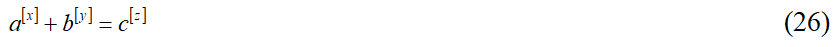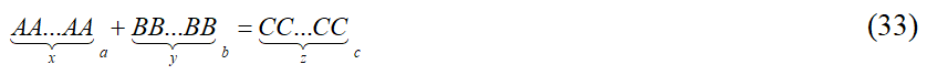 Уравнение гипотезы Била (в том числе и уравнение ее частного случая – Великой теоремы Ферма) – уравнение (27) – можно записать через представление чисел в той или иной системе счисления в таком виде: