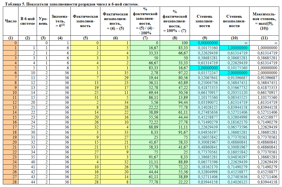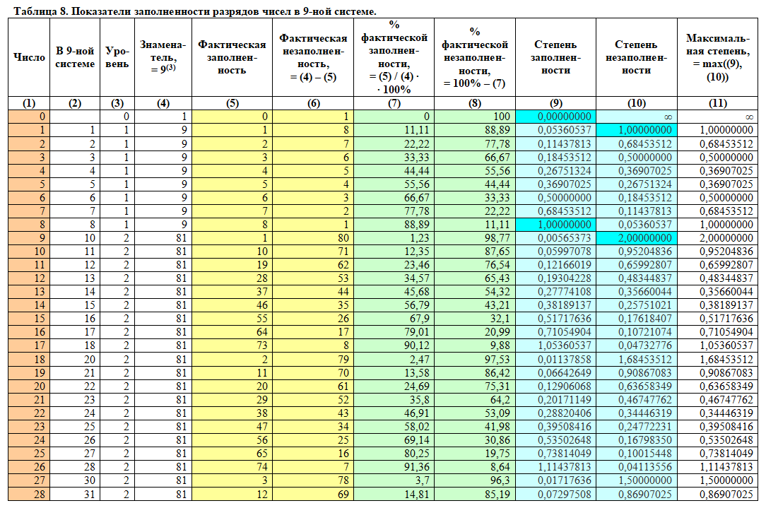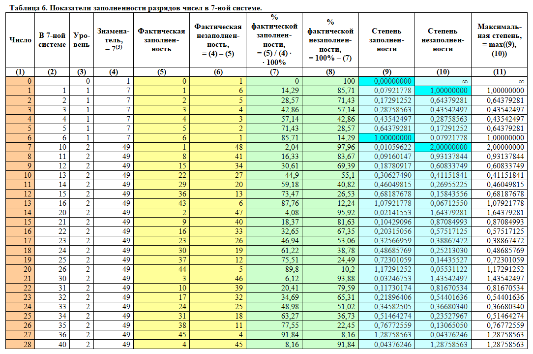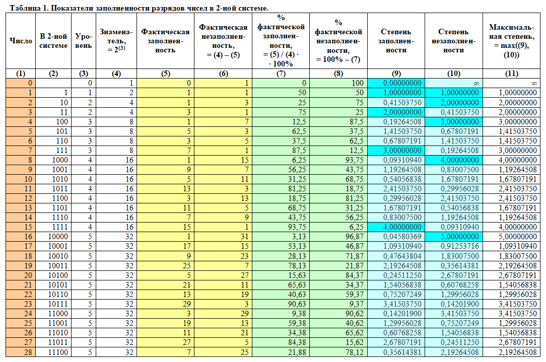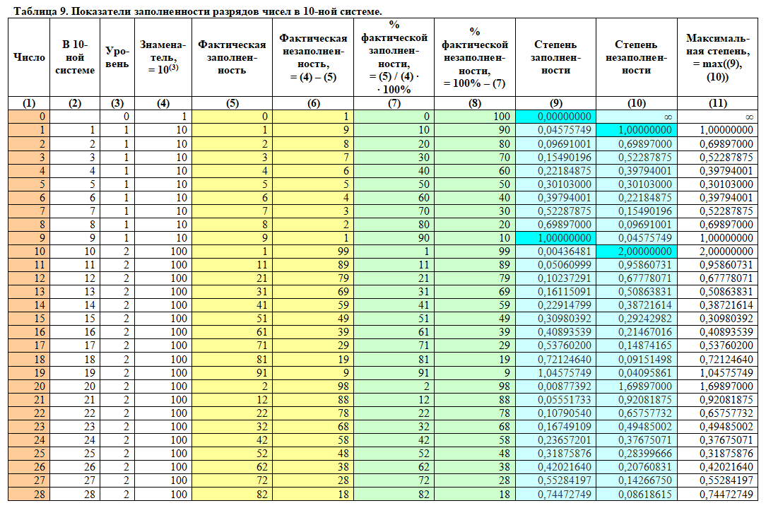 Как видно из таблицы, выше написанное правило всегда выполняется: если то или иное число «a» имеет максимальное целочисленное значение степени заполненности равное «n», то число «a + 1» имеет максимальное целочисленное значение степени незаполненности равное «n + 1». Для наглядности данная закономерность в таблице 10 отмечена цветами.