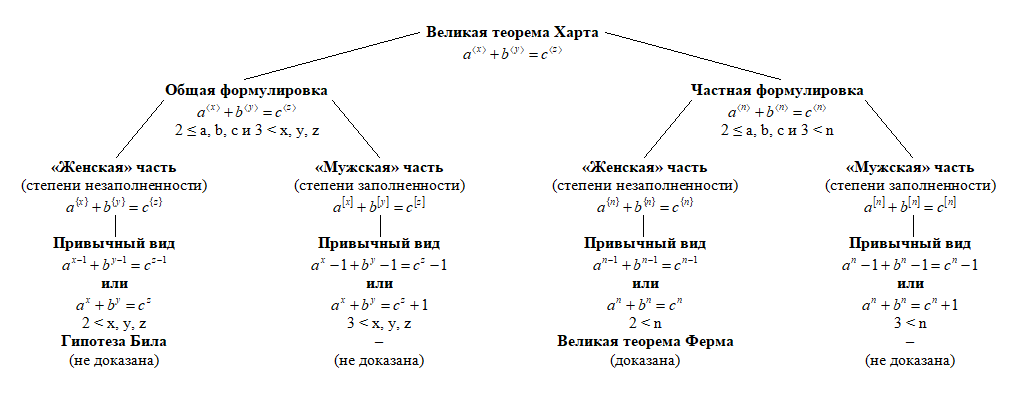 Это лишь подтверждает корректность формулировки обеих частей Великой теоремы Харта – «женской» части и «мужской» части, сделанных на основе понятия заполненности разрядов чисел. Переходя к одинаковым показателям степеней в обеих частях теоремы, можно отметить, что «женская» теорема – Великая теорема Ферма: