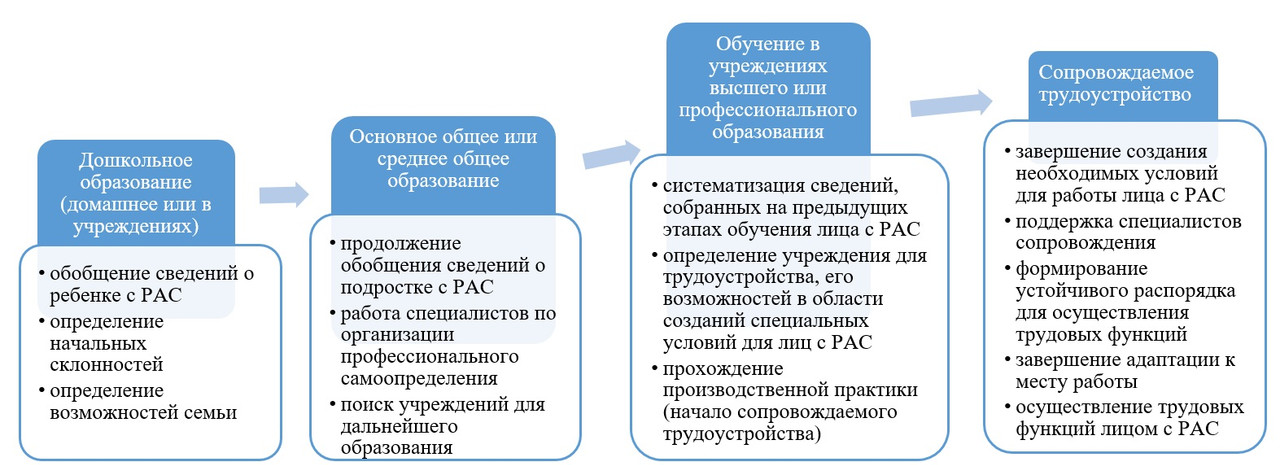 Таким образом, наша модель позволяет систематизировать поэтапное профессиональное развитие лица с РАС. С раннего детства формируются интересы и склонности, на основе которых затем выбирается учебное заведение для получения необходимого образования. Это образование является важным шагом на пути к будущему трудоустройству. лицам с РАС необходимо оказывать помощь при движении по разработанной профессиональной траектории. Правильная поддержка и сопровождение при трудоустройстве помогут лицам с РАС интегрироваться в трудовые отношения и, по мере возможности, строить свою карьеру.
