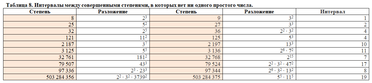 Рассмотрим интервалы между совершенными степенями, в которых не содержится ни одного простого числа. Первым таким интервалом будет интервал чисел 8 – 9. Здесь две степени расположены рядом, и между ними в принципе не может быть ни одного простого числа. Вторым таким интервалом будет интервал чисел 25 – 27. Третьим таким интервалом будет интервал 32 – 36. И т.д.