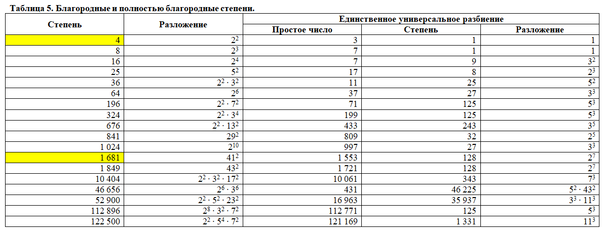 В данной таблице также желтым цветом выделены полностью благородные числа. Как видно из таблицы, всего благородных степеней 16 (последнее 122 500), всего полностью благородных степеней 2 (последнее 1 681). Было проанализировано степеней максимум до 10 млн.