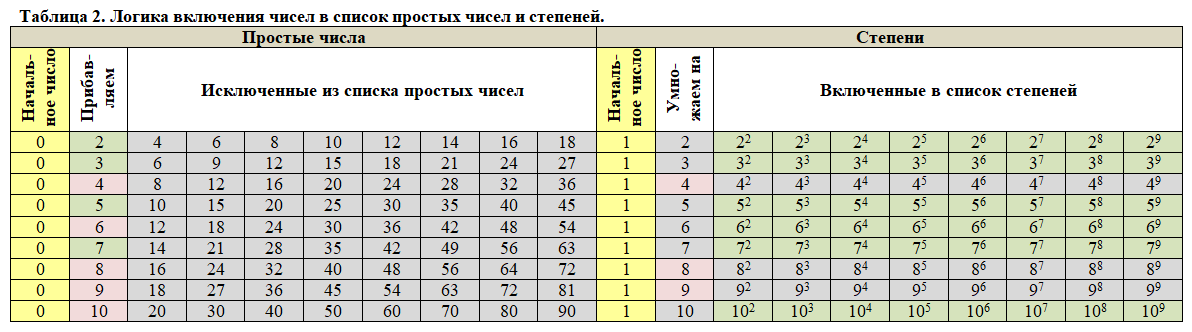 В обоих случаях мы смотрим на прибавляемое / умножаемое число. Если оно уже было у простых чисел в списке исключаемых ранее (например, число 4), то оно не включается в список простых чисел. А если оно уже было в списке включенных ранее степеней (например, то же число 4), то все последующие результаты умножения на это число не включаются в список степеней, чтобы не было их повторения. (См. таблицу 2. В ней зеленым цветом выделены числа, включенные в список простых чисел или степеней; серым цветом – исключенные; красным цветом – числа, исключенные / включенные ранее в список простых чисел / степеней.)