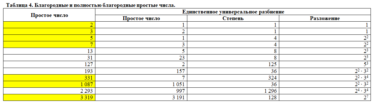 Приведем теперь в таблице список степеней, являющихся благородными или полностью благородными числами: