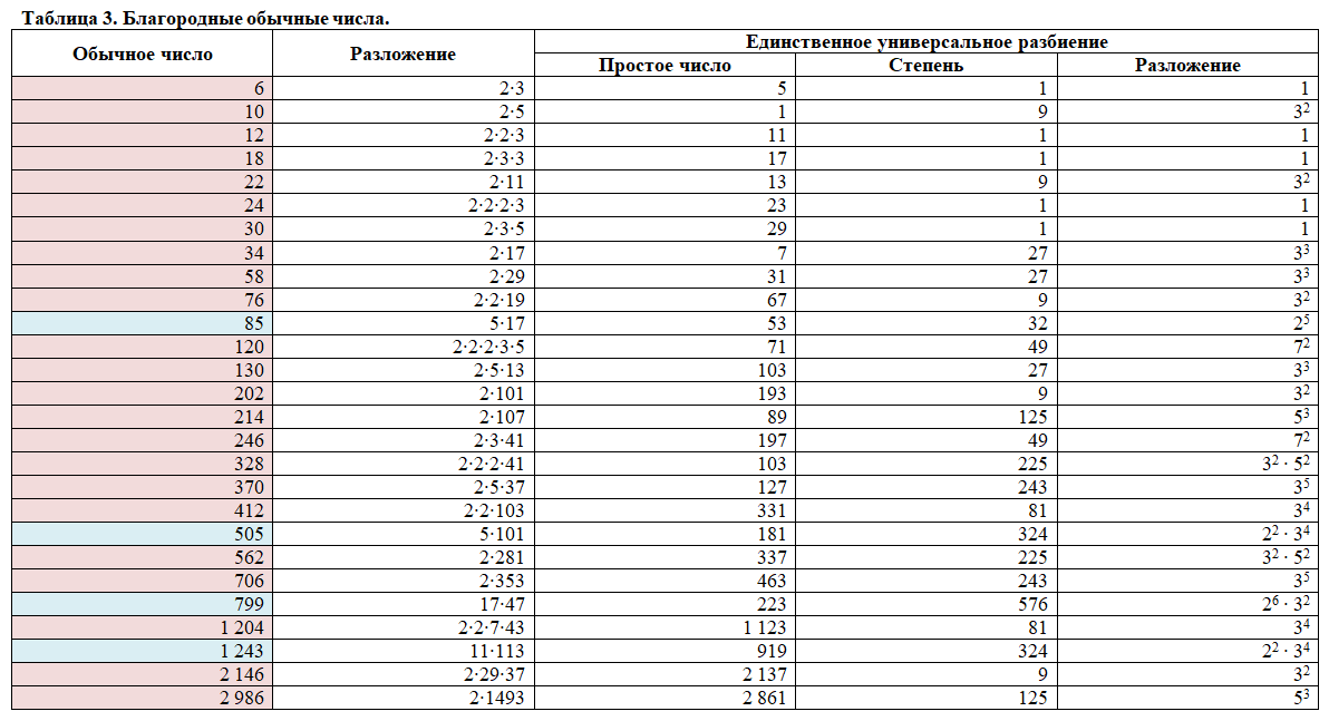 В данной работе было проанализировано обычных чисел максимум до 1 млн., и, как видно из таблицы 3, последним благородным обычным числом является число 2 986, всего же их 27, 4 нечетных (голубые) и 23 четных (розовые).