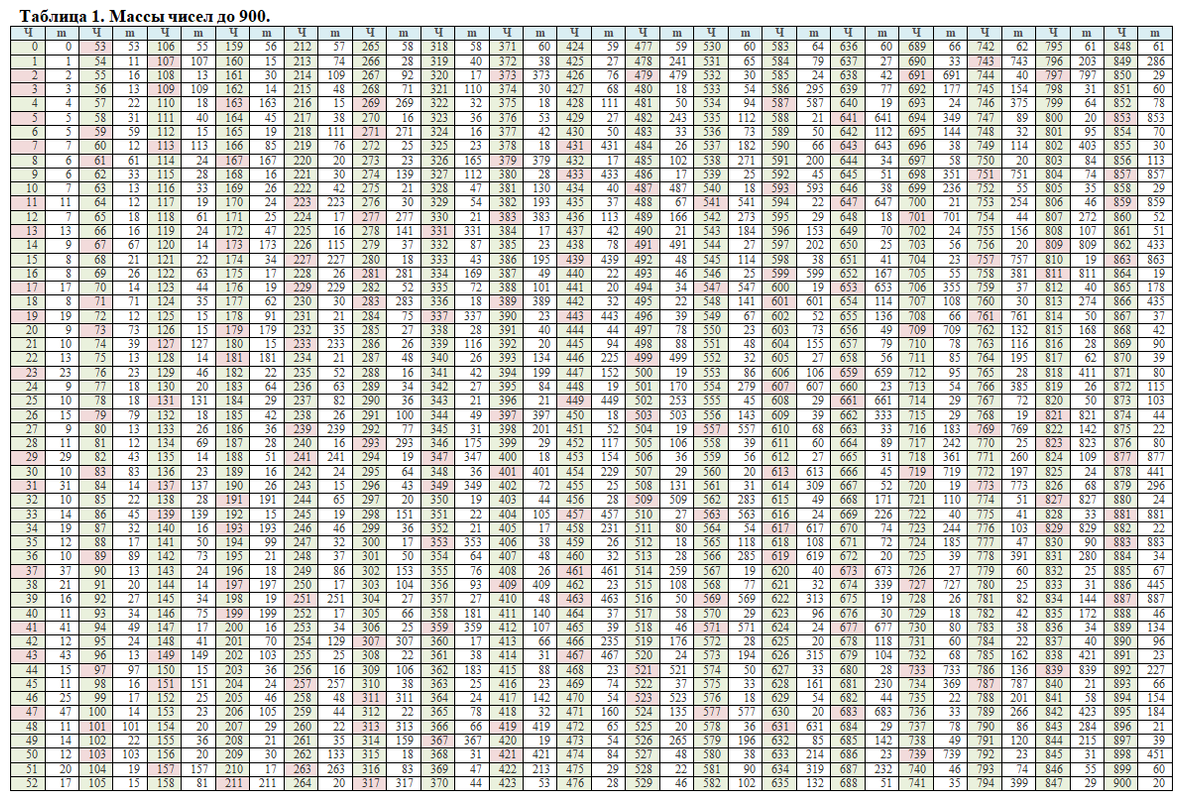 3. Приведена таблица масс чисел до 900.
